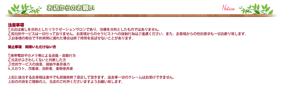 疲れた体にちょっとごほうび…貴方の癒しの時間は当店と共に… 日々都会の幻想と毎日の仕事に追われ疲れを溜めたりしていませんか? そんな時は粋な音楽を聞き素敵なセラピストにマッサージされ、 まったりと大人のムードに浸る癒しの時間なんていかがでしょうか? 本日も皆様のお越しを従業員一同心よりお待ち致しております♪